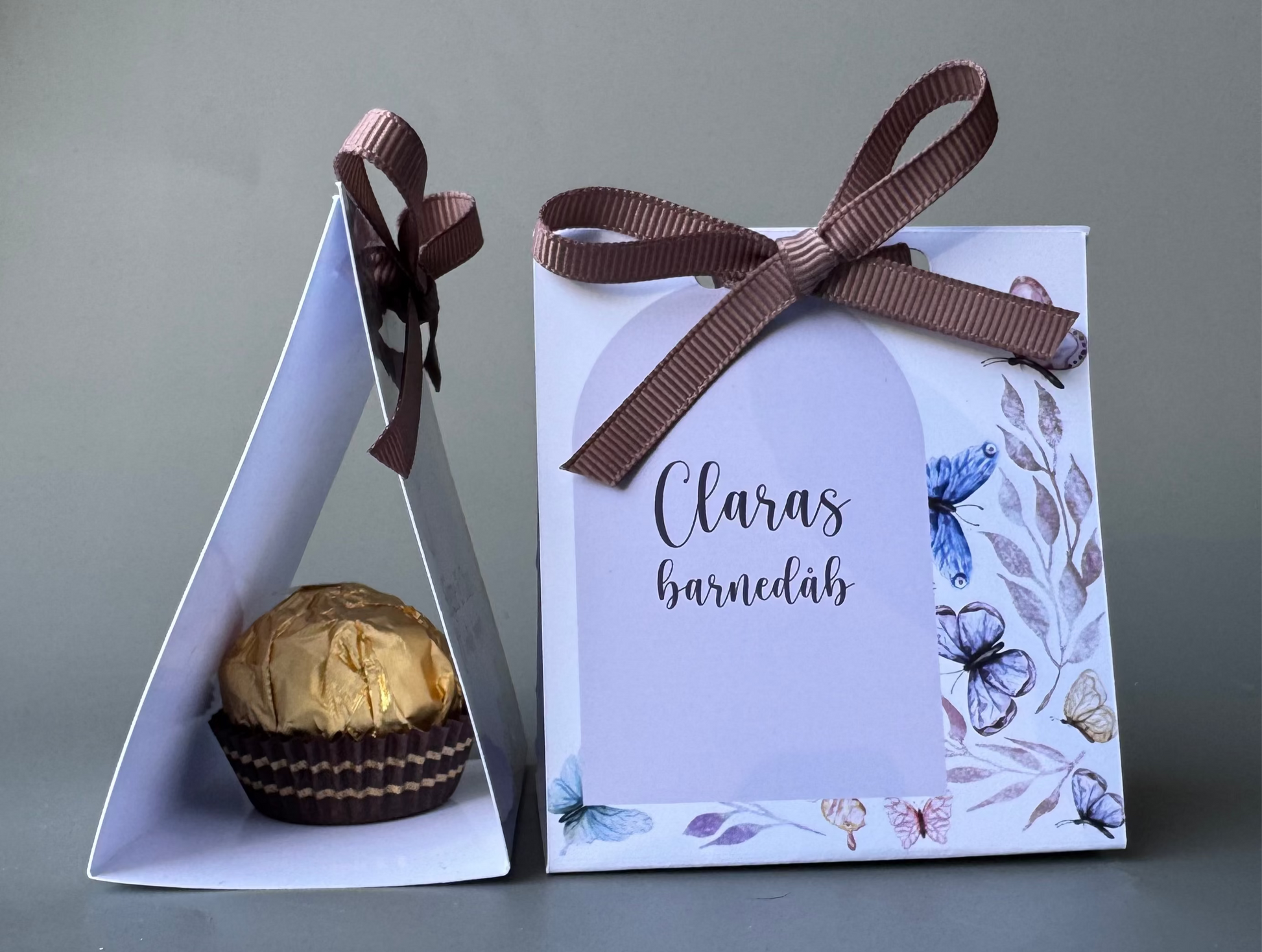 Æsken er ideel til en lille chokolade eller sød gave, som gæsterne kan tage med hjem som et personligt minde fra dagen. Chokolade medfølger ikke, så du kan frit vælge din yndlingsvariant – fx Ferrero Rocher, Lindt eller håndlavet konfekt.